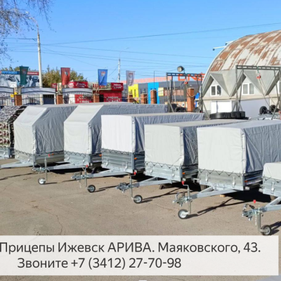 В магазине прицепов АРИВА в Ижевске на площади 1500 квадратных метров умещаются более 40 разных моделей прицепов для легковых автомобилей. Каждый день мы предлагаем вашему вниманию прицепы для дачи с размером кузова: 2м, 2,5м; прицепы для строительных материалов: 2,5м, 2,73м, 3м; прицепы для снегоходов: 3м, 3,5м; двухосные прицепы: 2,5м, 2,73м, 3м, 3,5м, 4,5м, 5м, 6м, 7м, 8м; прицепы для лодок длиной: 3м, 4м, 4,5м, 5м, 5,5м; прицепы для катеров: 5 метров, 6 метров, 7 метров, 8 метров; а также прицепы с тормозами, прицепы фургоны, прицепы страпами для заезда техники, прицепы автовозы. Цены на прицепы заводские.